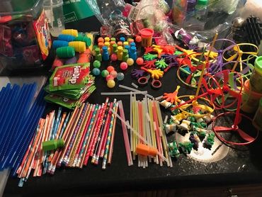 Filled with a mini soccer ball, foozball pencil, ring pop, huge centipede and more.